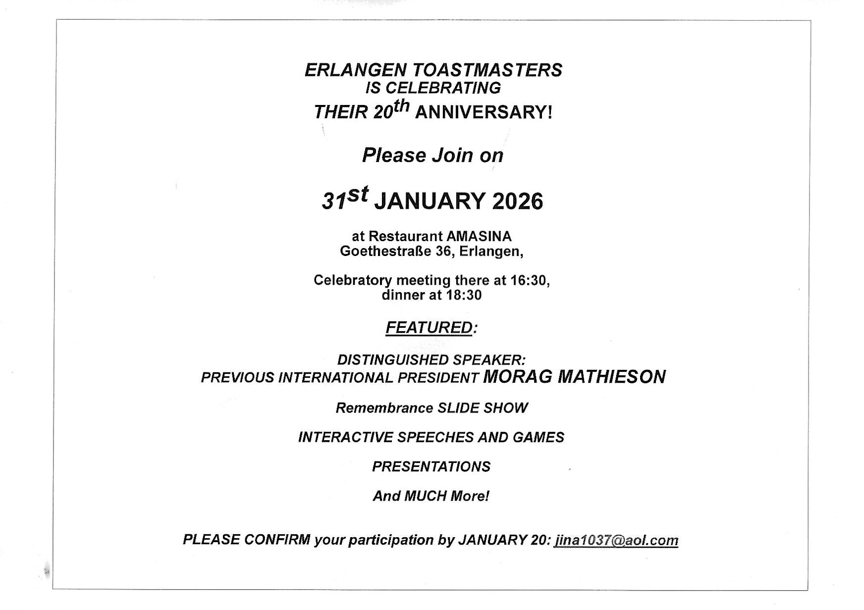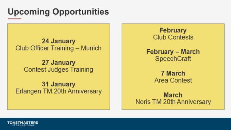 2 Feb – Nuremberg Toastmasters 18 Feb – Erlangen Toastmasters